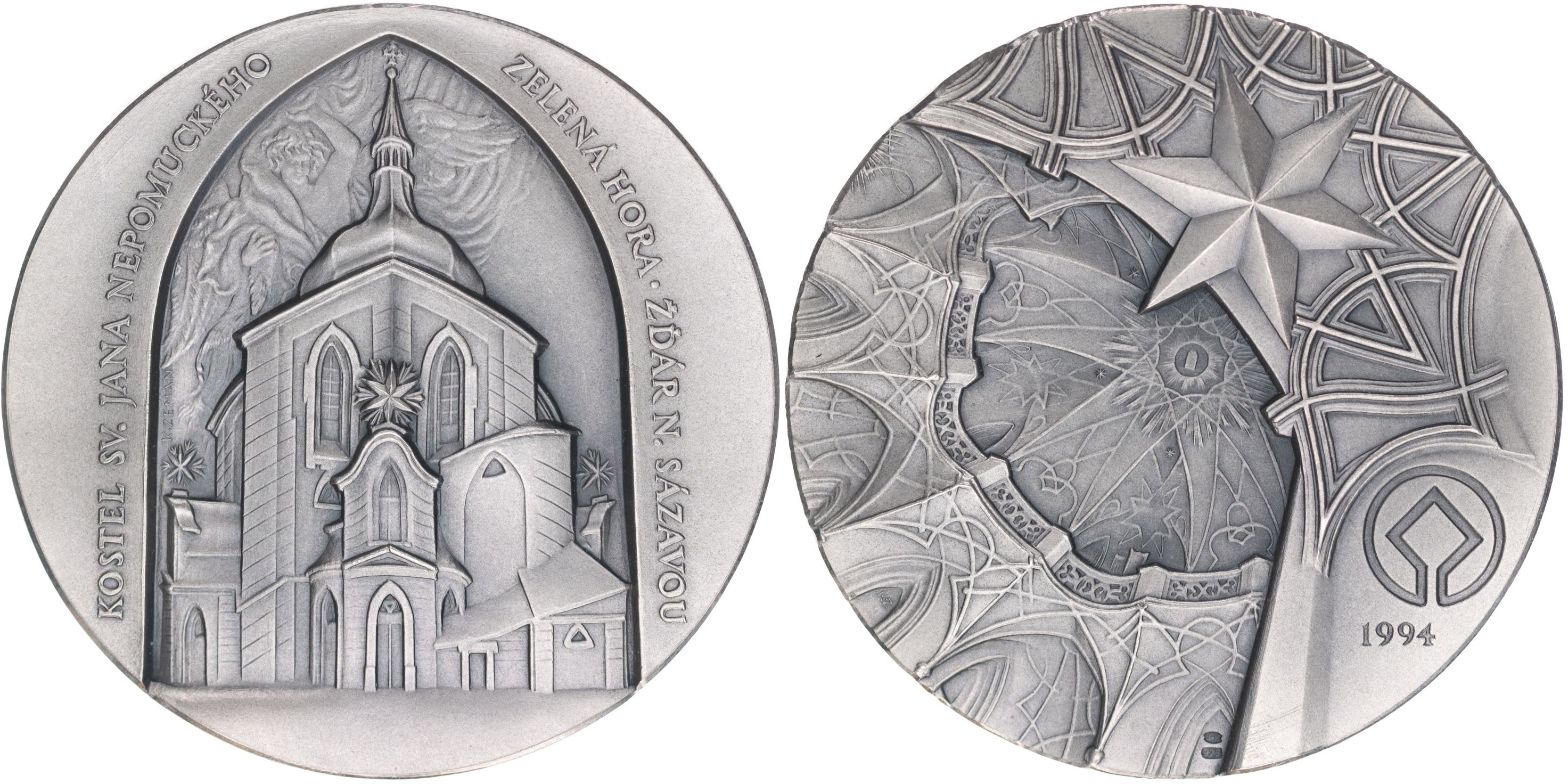 Zelená Hora - Žďár nad Sázavou - kostel sv.Jana Nepomuckého 1994 Pohled na kostel v gotickém oblouku, opis / pohled na strop kostela, šesticípá hvězda, vročení, Sign.K.Zeman, Punc.Ag 50 mm, 58,98 g