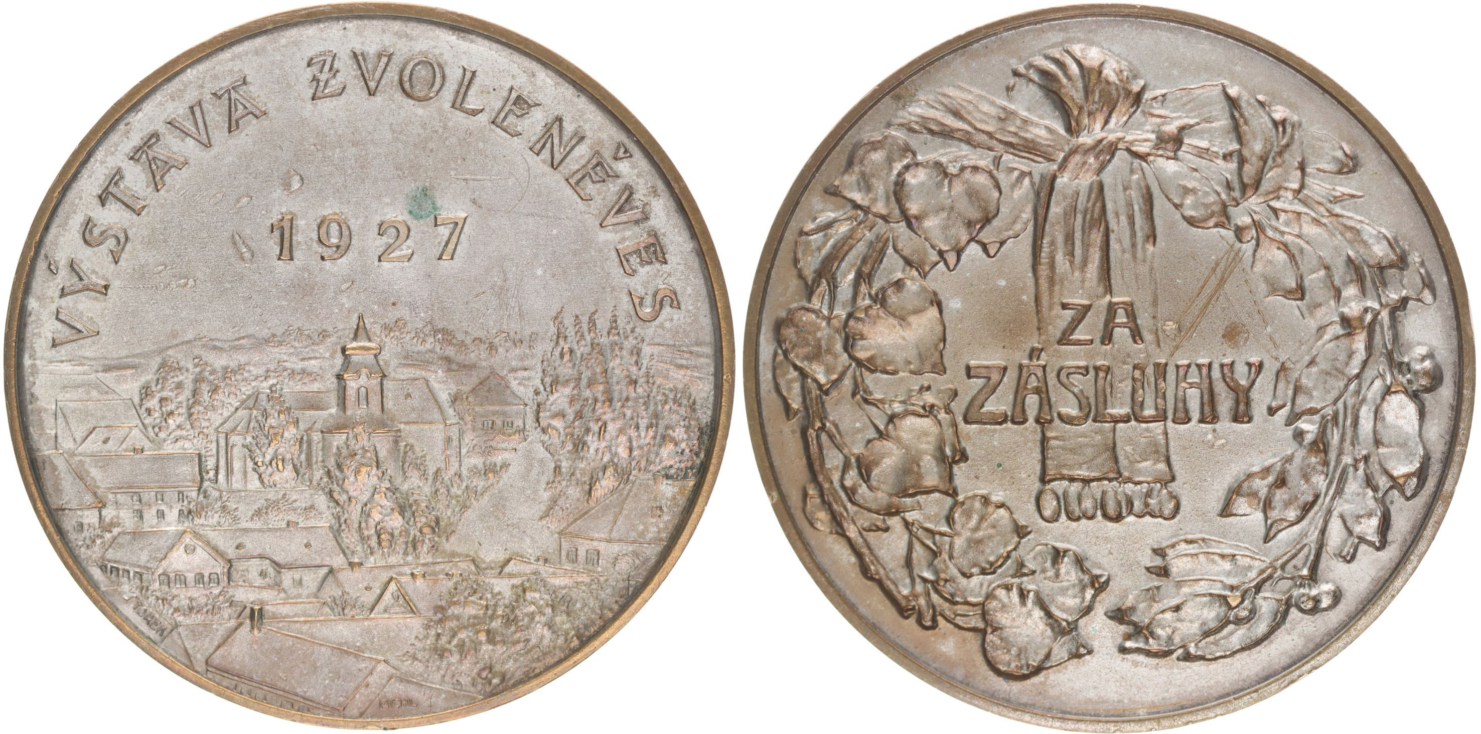 Výstava Zvoleněves 1927- Za zásluhy, pohled na obec, opis / 2řádk.nápis v ozdobném věnci, Sign.Štorek, Pichl, Postř.bronz 50 mm_dr.škr. R!