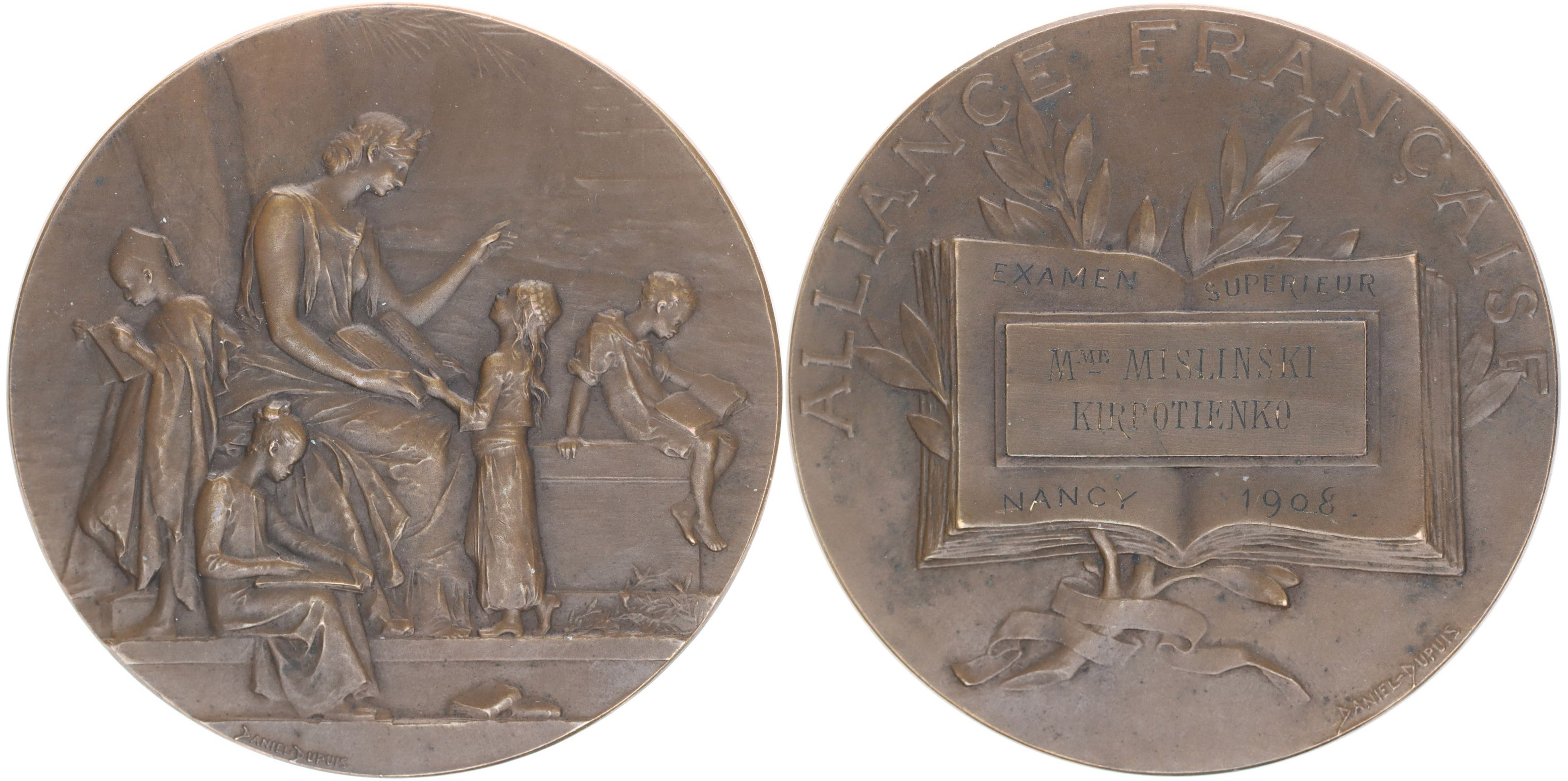 D.Dupuis - školní medaile 1908, žena se čtyřmi dětmi / otevřená kniha s věnováním na jméno "Mme MISLINSKI KIRPOTIENKO" Nancy 1908, sign., Bronz 68 mm, 122,83 g