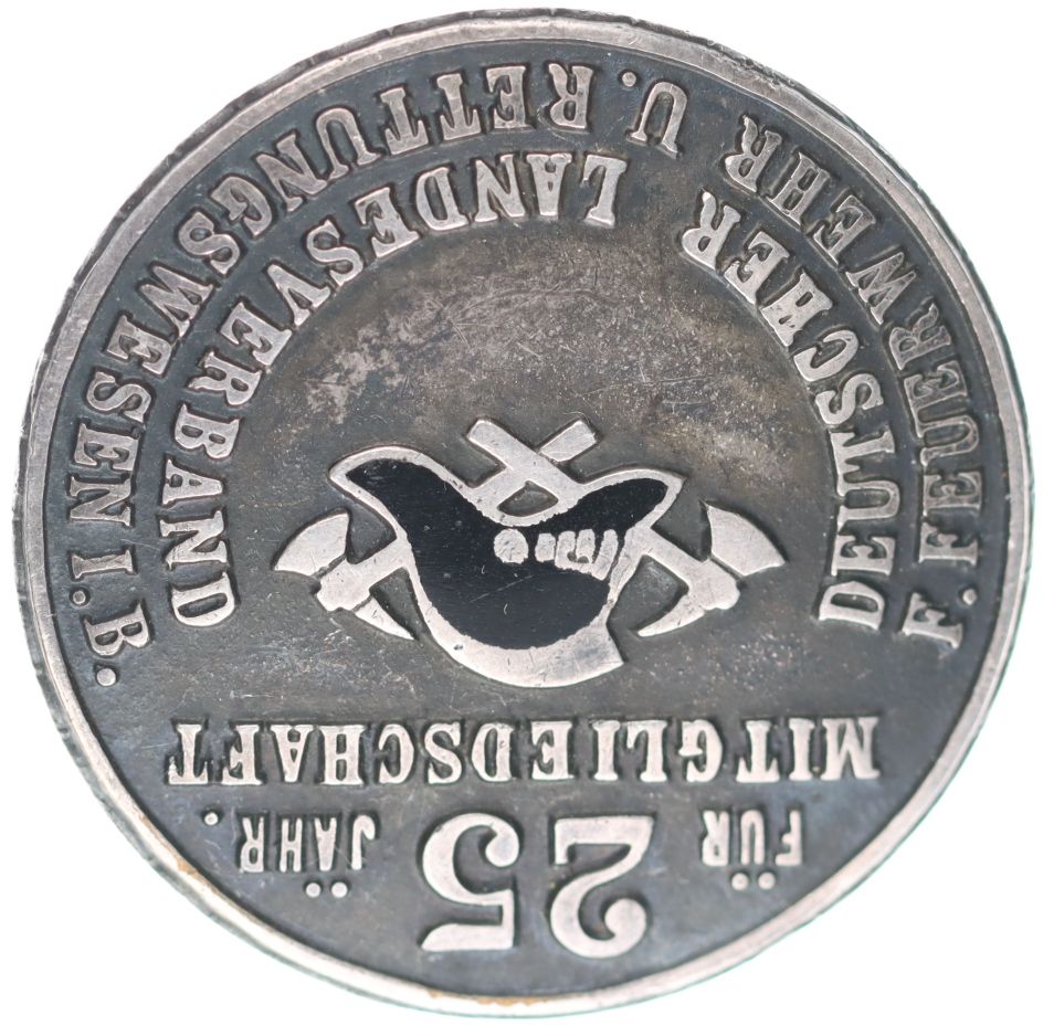 Německý zemský spolek - za 25leté členství v dobrovolném hasičském a záchranářském sdružení, hasičské atributy, 2řádk.nápis, 2řádk.opis v úseči, Kruh.odznak z bílého kovu 32 mm_připínací