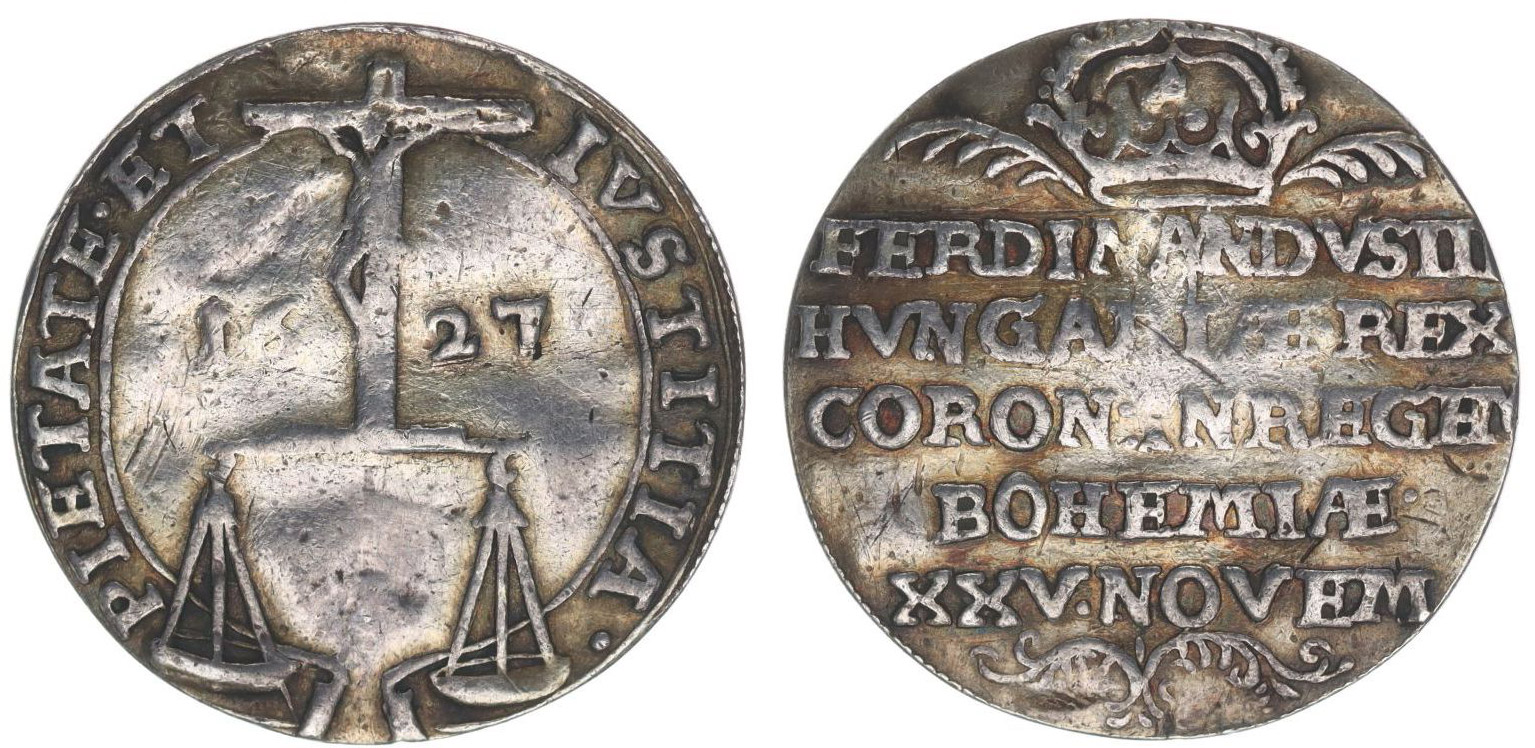 Velký jeton na korunovaci v Praze, 25.XI.1627 Kristus na kříži, váhy, opis / koruna, nápis, ornamenty Nesign., Ag 25,5 mm, 3,00 g, Nov.VII/B-2b, ČS.626, Don.2348, Mo.788