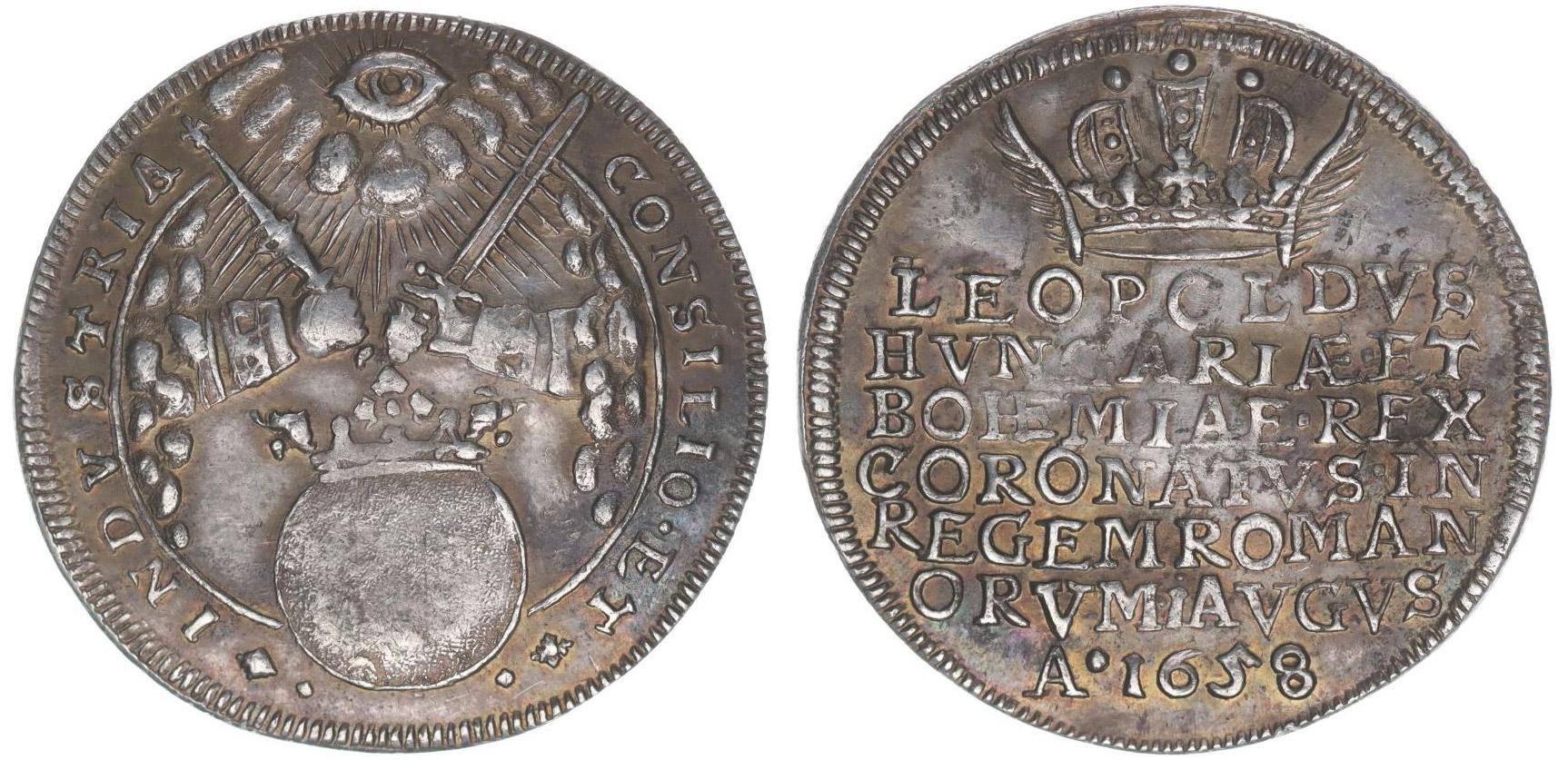 Velký žeton na císařskou korunovaci ve Frankfurtu, 1.8.1658 Koruna držená anděly, 6řádk.nápis / pod božím okem drží dvě ruce žezlo a meč, Ag 29 mm, 5,21 g, Nov.IX/E-9b, Mo.872 _dr.zvlněný