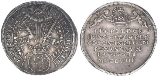 Velký žeton na císařskou korunovaci ve Frankfurtu, 1.8.1658 Koruna držená anděly, 6řádk.nápis / pod božím okem drží dvě ruce žezlo a meč, Ag 29 mm, 4,46 g, Nov.IX/E-9b, Mo.872