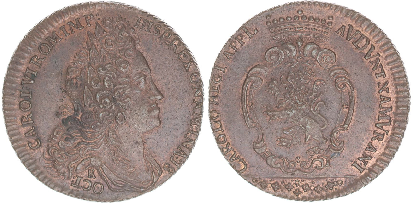 P.L.II.Roëttiers - na holdování v Namuru 1717 Poprsí zprava, opis / lev zleva v ozdobné kartuši, opis Sign., Bronz 30 mm, 9,92 g, Nov. XI/V-1a, Mo.1492, LG.XV/714