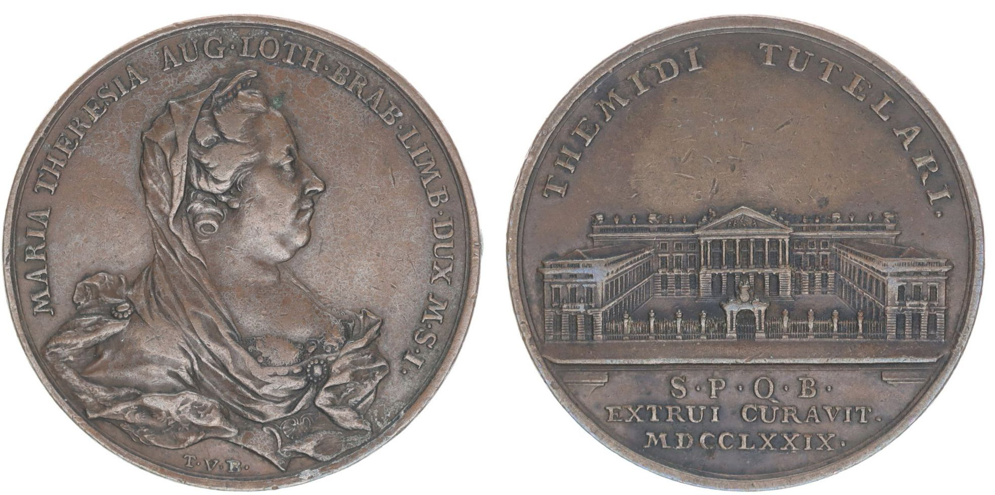T.V.Berckel - medaile na stavbu justičního paláce v Bruselu 1779 Poprsí zprava, opis / pohled na justiční palác, 3řádk.nápis v úseči, latinský opis, Sign.T.V.B., Bronz 33 mm, 12,22 g, Mo.2089, Berckel.72 SD.CCLXXII_R!