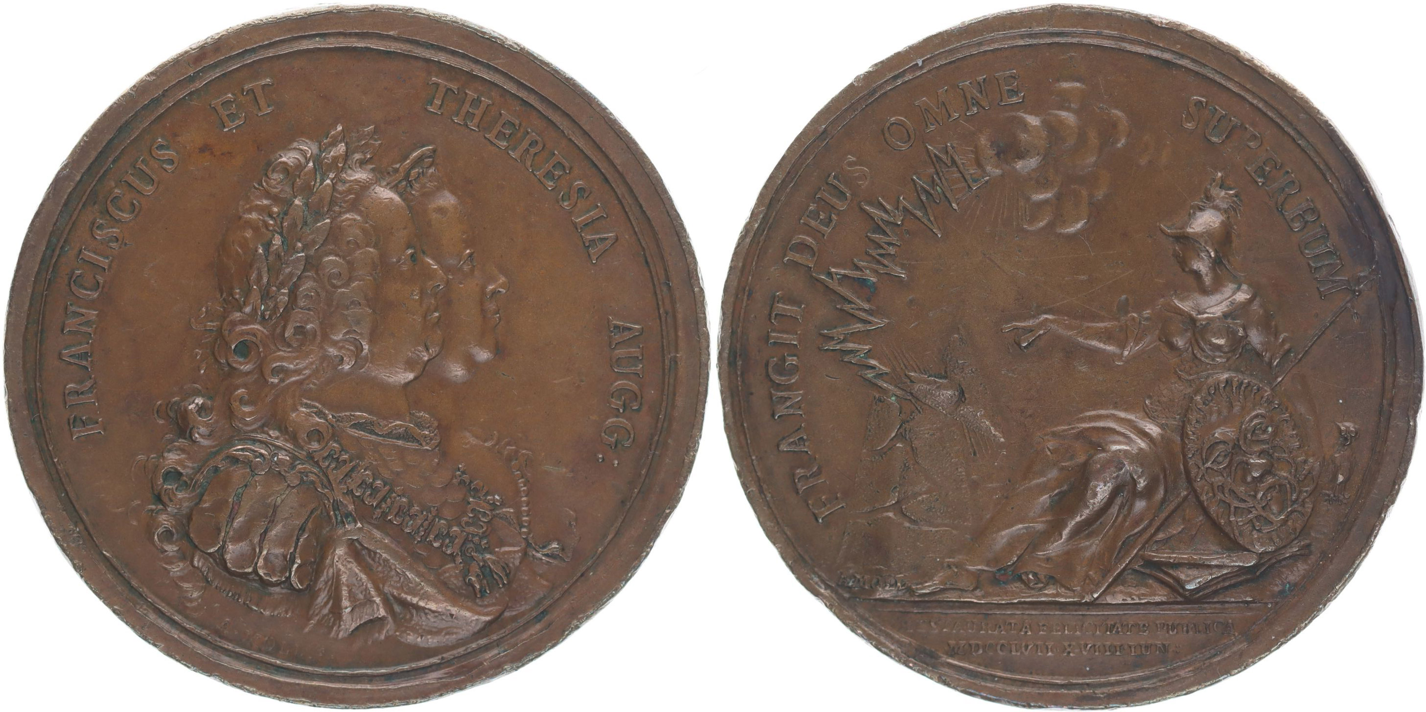 A.Moll - medaile na odchod Prusů z Čech 18.6.1757 Dvojportrét zprava, opis / sedící Victoria se štítem, blesky nad pyramidou, opis, Sign., 50 mm, 43,6 g, Mo.1854, LG.XIV/139 _dr.hry R!