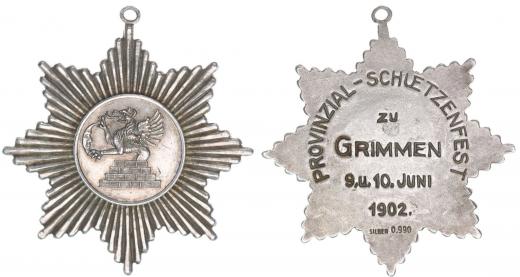 Německo - Pommern (Pomořany) - střelecký odznak k regionální střelecké slavnosti 9. a 10.6.1902 8cípá paprskovitá hvězda, uprostřed pomořanský znak, Punc.0,990 Ag 36,5x36,5 mm_orig.ouško