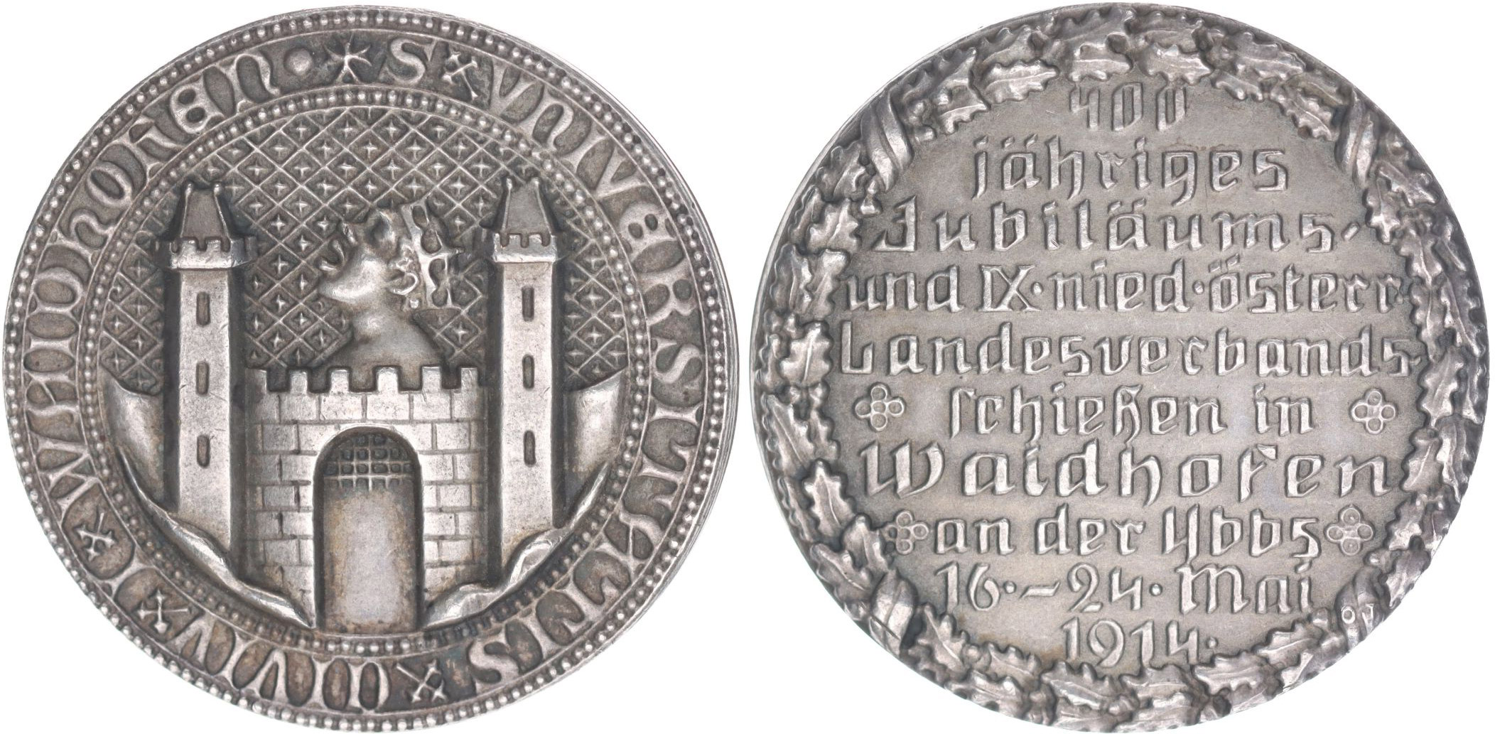 Rakousko - Waidhofen - medaile k 400.výročí a IX.dolnorakouské střelby 16.-.24.5.1914, znak města, opis / 10řádk.nápis ve věnci Nesign., Punc. Ag 36 mm, 19,95 g