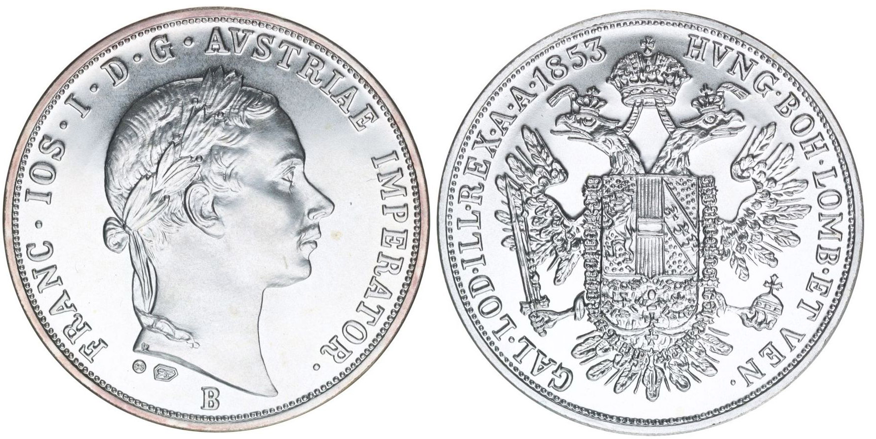 1/2 Tolar 1853 B - oficiální novoražba Ag 900/1000, 30 mm, 13,2 g vydala minc.Kremnica, nákl.200 ks_orig.kapsle + dřev.etue + certifikát