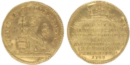 Menší korunovační žeton na korunovaci v Praze 12.5.1743 Korunovaný lev se znakem a křížem, opis / 8řádk.nápis pod korunou Au 21 mm, 2.69 g, Nov.XIII/G-3a, ČS.1313_RR!