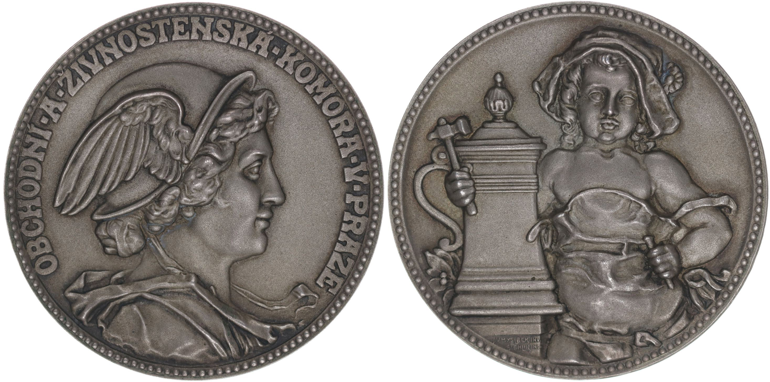 Obchodní a živnostenská komora v Praze, b.l.#Ag Poprsí Merkura zprava, opis / Dětská postava drží korbel, kladivo a sekáč, Sign., Punc. Ag 50 mm, 61,95 g