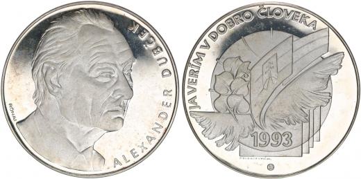 Alexander Dubček - Já verím v dobro človeka, 1993 Hlava mírně zprava, opis / na glóbu slovenská vlajka a ratolest Sign., Punc.900, Ag 40 mm, 37,49 g_orig.kapsle