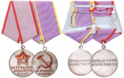 Medaile za pracovní hrdinství, 2.typ, var.4, Ag 925, nepunc., nečíslov., smaltov., Barac.888, Herf.3.1.2 Medaile za vynikající práci, 2.typ, var.4/2, Nepunc., Ag 925 nečíslov., smaltovaná, Barac.892, Herf.3.2.2 _spojka stuh obou medailí