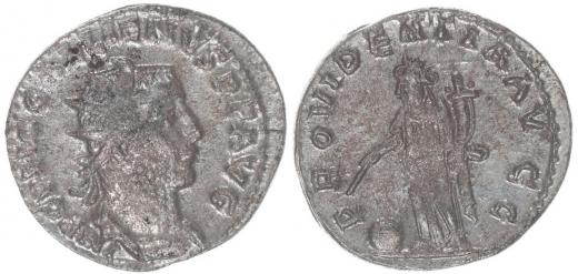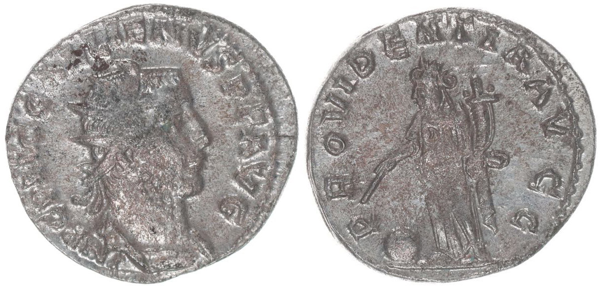 AR Antoninianus, Rv:"PROVID. AVGG", stojící Providentia zleva s glogem a žezlem, S.2888, C.859