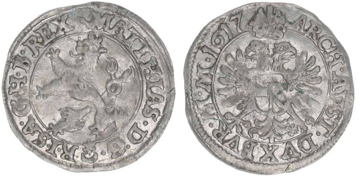 Bílý groš 1617, Praha-Hübmer, J.2b, MKČ.514 var.: přední tlapy zasahují do vnitřního kruhu