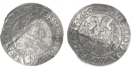 3 Krejcar 1625 S-F, Opolí-Frenzel, MKČ.1106, Her.1308b, SJ.192/61 _č.ned, naprasklý, zvlněný R!