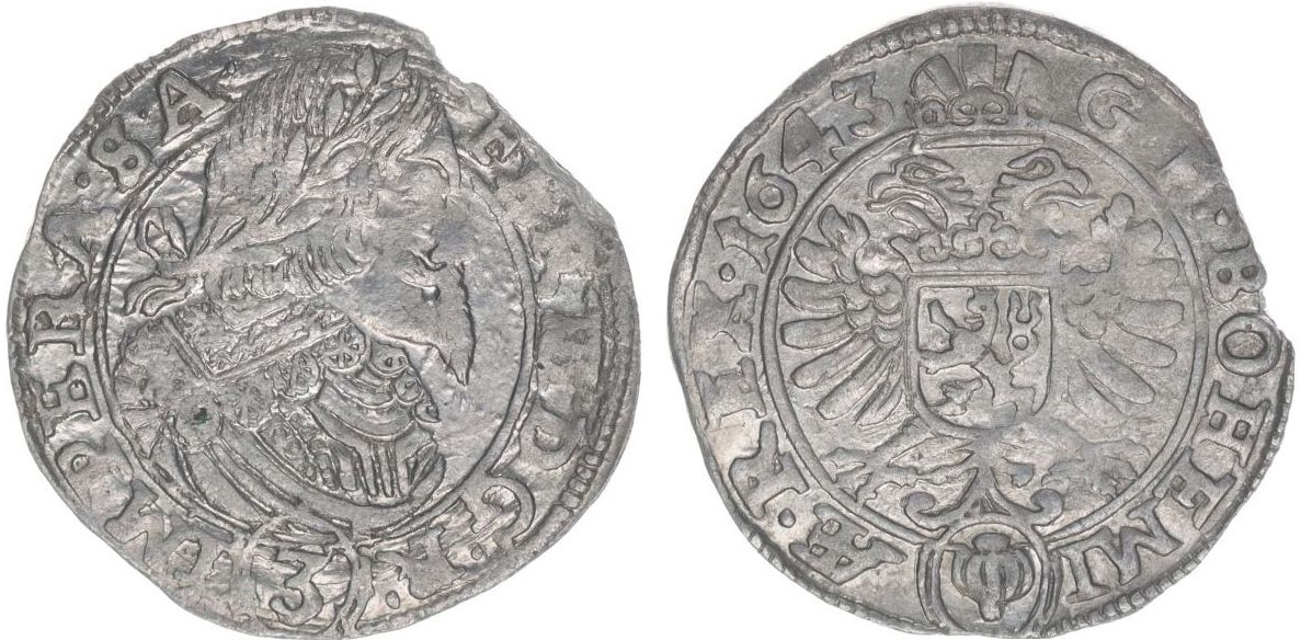 3 Krejcar 1643, Jáchymov-Knobloch, J.5b, MKČ.1220 _vyl.okr. 7 mmm R!