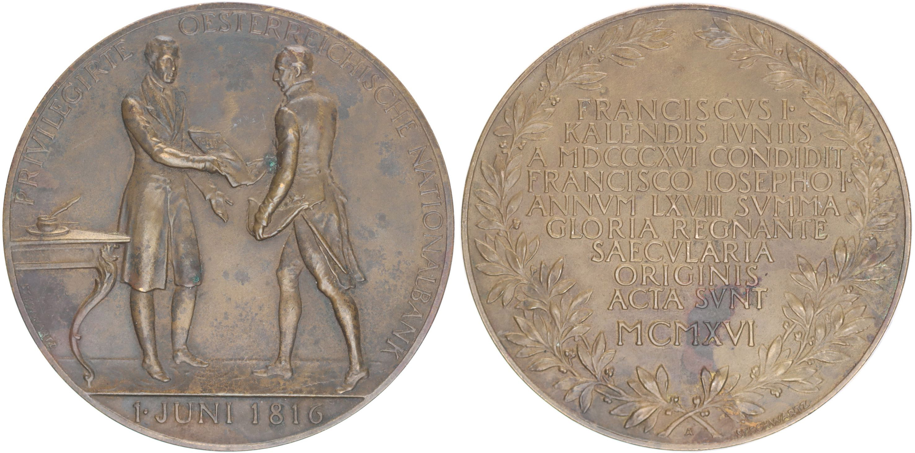 St.Schwartz - 100 let založení Rakouské národní banky 1816 - 1916 Císař František I. předává zakl.listinu, opis / 10řádk.nápis ve věnci Bronz 65 mm