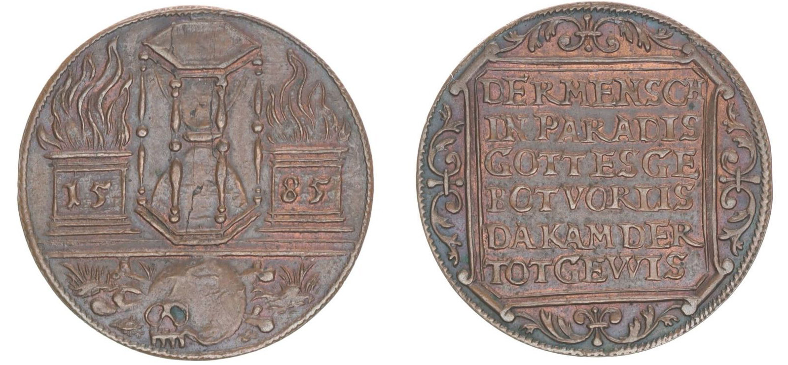 Početní žeton 1585, tzv.moralizující, přesýpací hodiny mezi dvěma oltáři s plápolajícím ohněm, dole lebka a kosti / 6řádk.nápis, vročení Nesign., Cu 25 mm, 2.60 g, Pol.158, Neum.1001-2, Prok.D.1/5_RR!