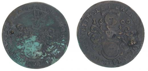 Početní groš společný s druhou manželkou Veronikou z Weimile 1600, znka s osmiocípou hvězdou, opis / volný znak s korunovanou přilbicí, opis, Cu 26,5 mm, Pol.214, Do.3930 Prik.B227/1a,b_naznač.dírka starý podl.lístel R!