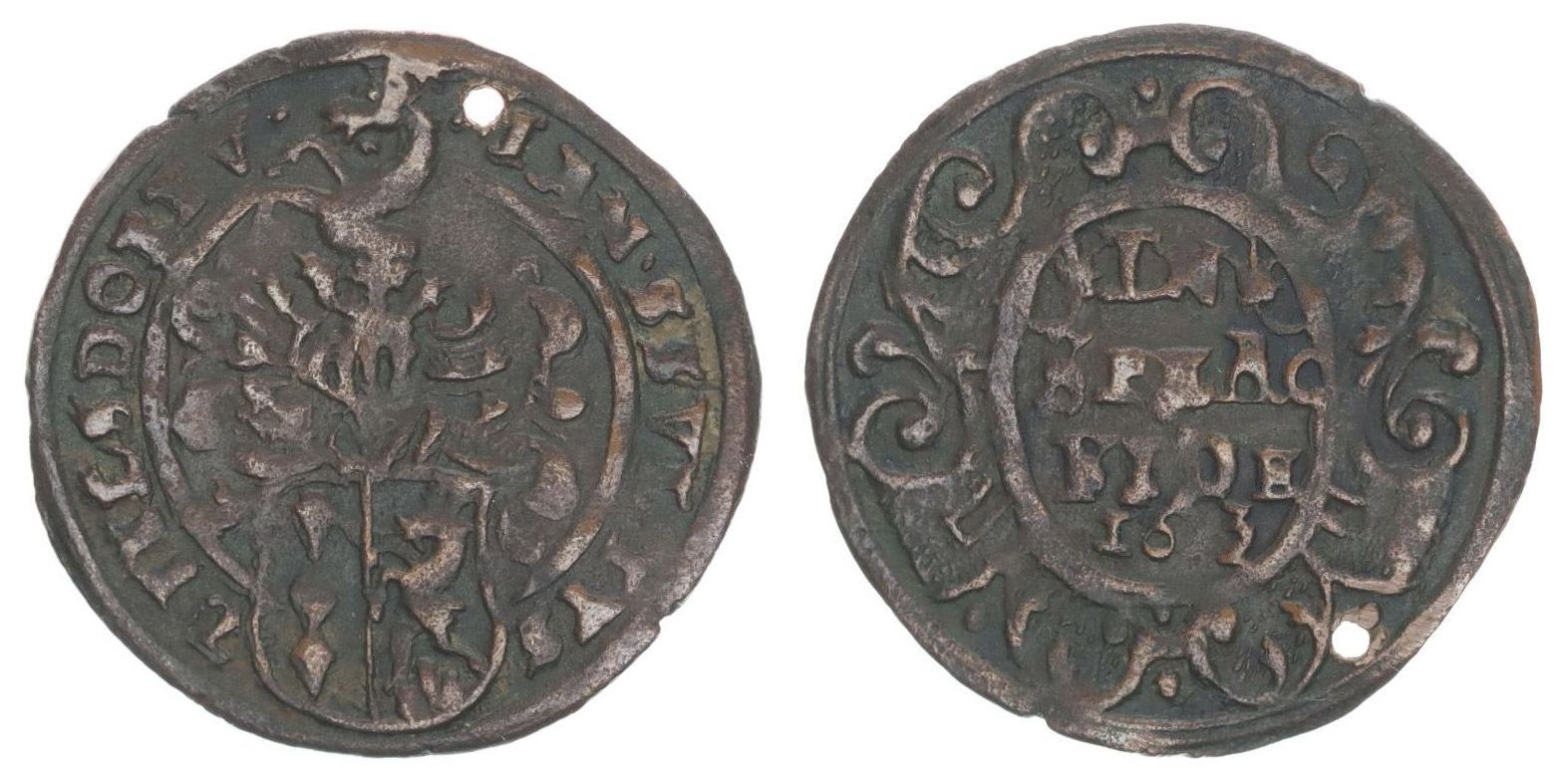 Žeton měděný 1613, znak s přilbicí a klenotem, opis / ozdobná oválná tabulka se 4řádk.latinským nápisem, Cu 25.5 mm, Pol.216, MN.567, Do.3861, Ho.7837, Prok.B.243/1b_dírka