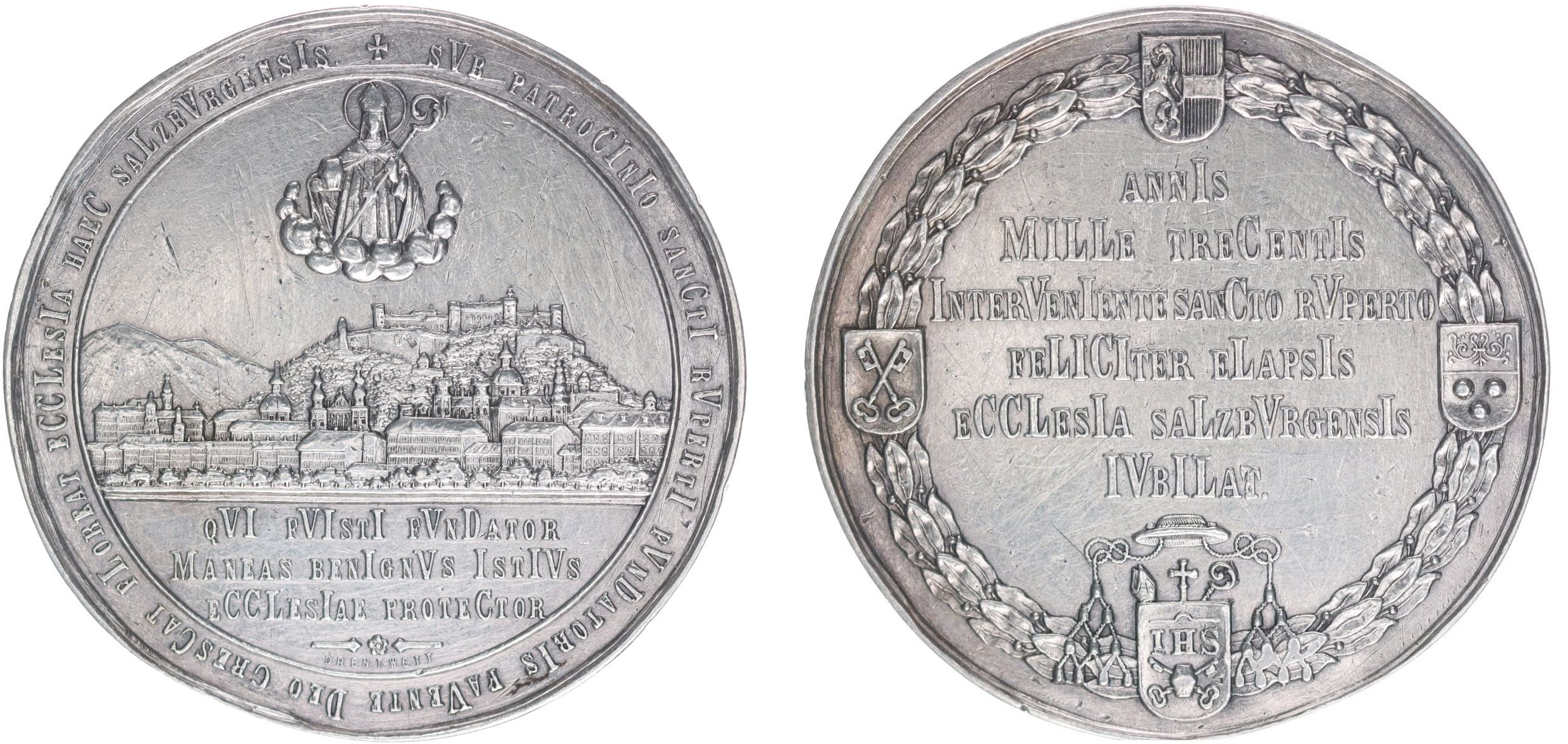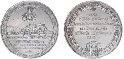 Drentwett - medaile k 1300.výr. založení kláštera v Salzburgu 1882 Pohled na klášter, 4řádk.nápis v úseči, opis / 6řádk.nápis ve věnci se čtyřmi znaky, Sign., Ag 41 mm, 22,85 g, Macho.134