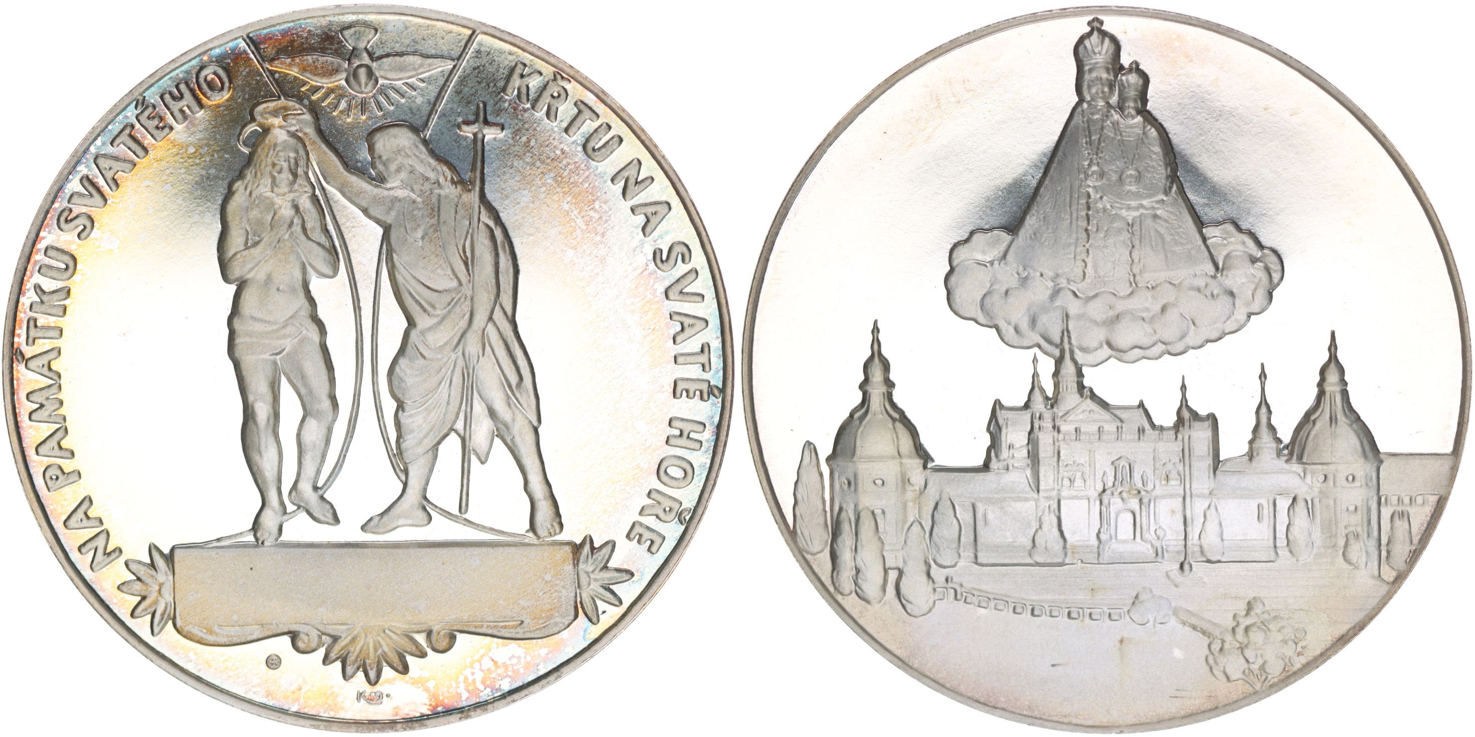 Na památku svatého křtu na Svaté hoře, b.l. Pod Duchem svatým křtí sv.Jan Krista, opis / Panna Marie na oblaku, pohled na klášter, Sign.KJ+MK, Postř.med.50 mm