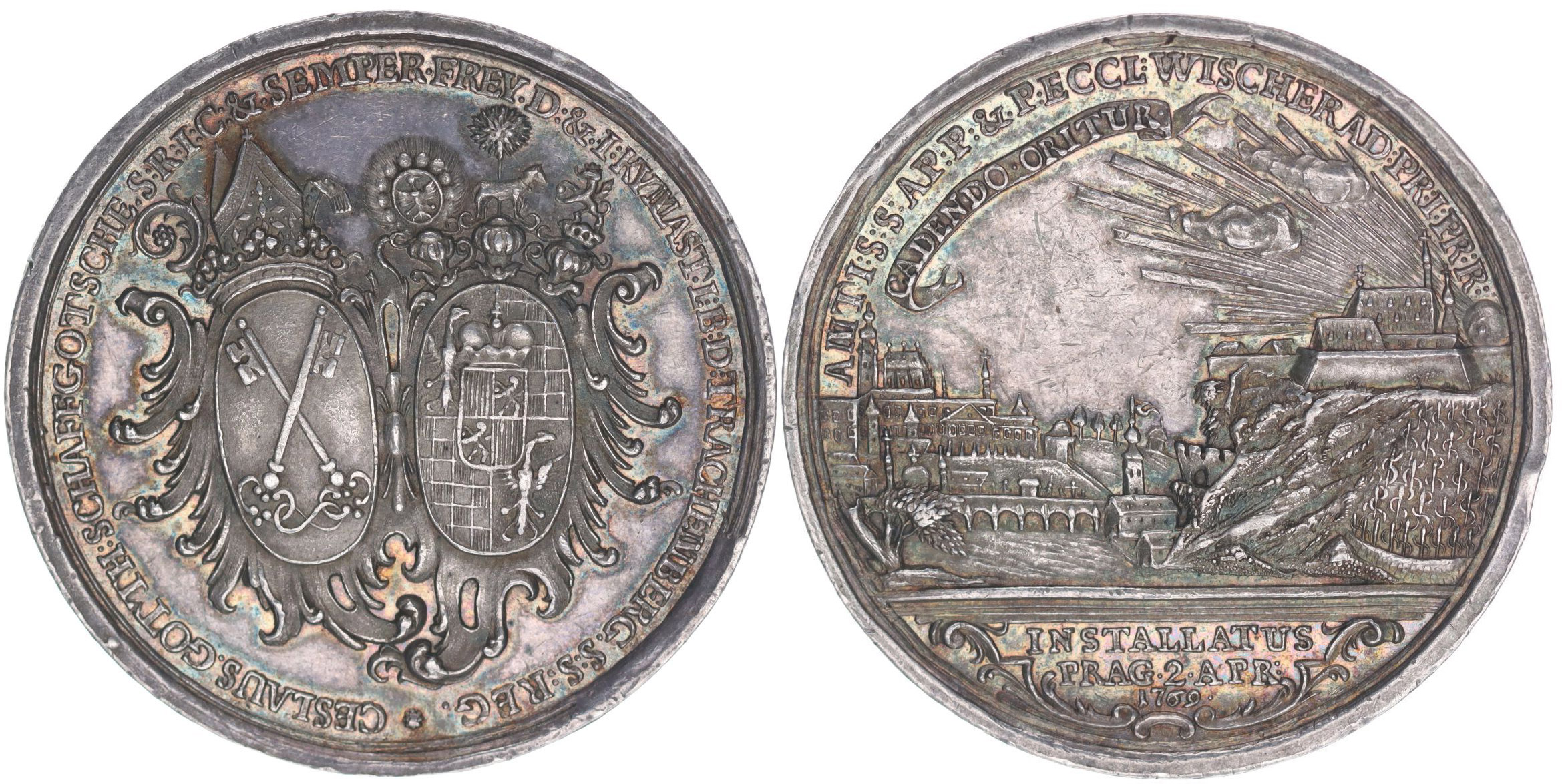 Nesign. - Ag instalační medaile, 2.4.1769, dva znaky, opis / pohled na Vyšehrad a Pražský hrad, opis, Ag 40 mm, 22,135 g Přib.689, Gr.172, Do.4692