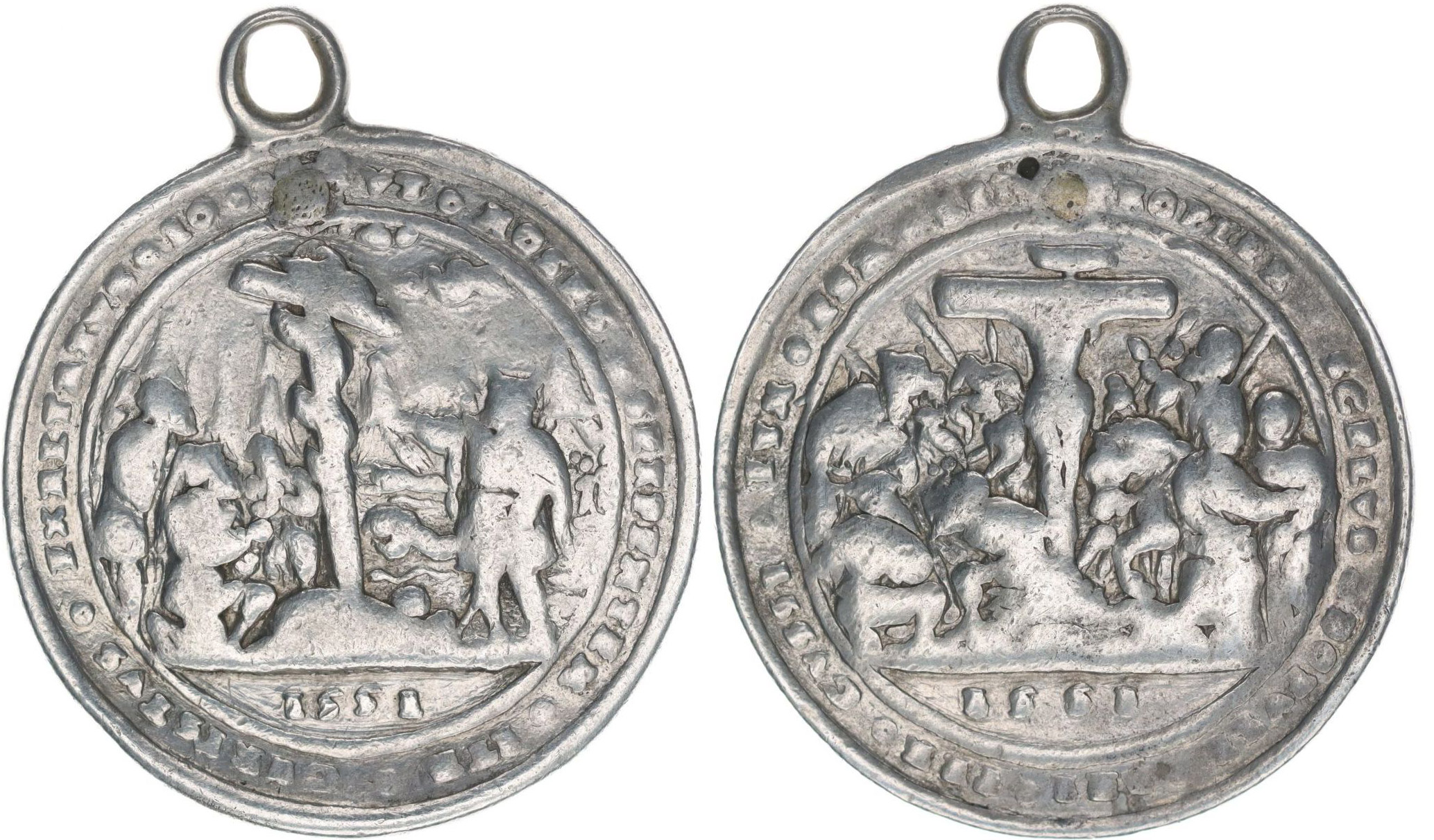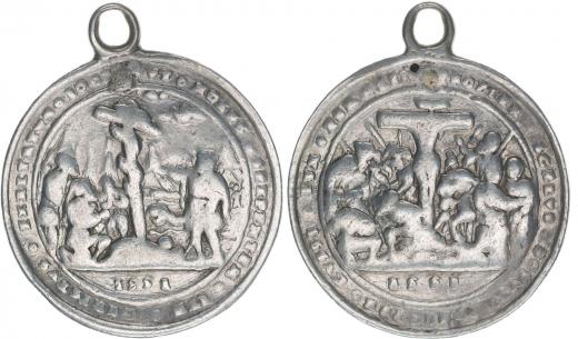 Morová medaile z r.1551, had na kříži mezi Izraelity, opis / ukřižování Krista, opis, Ag 35 mm, 13,66 g, Katz.368, tab.LV/8 Kill.5802_ouško R!