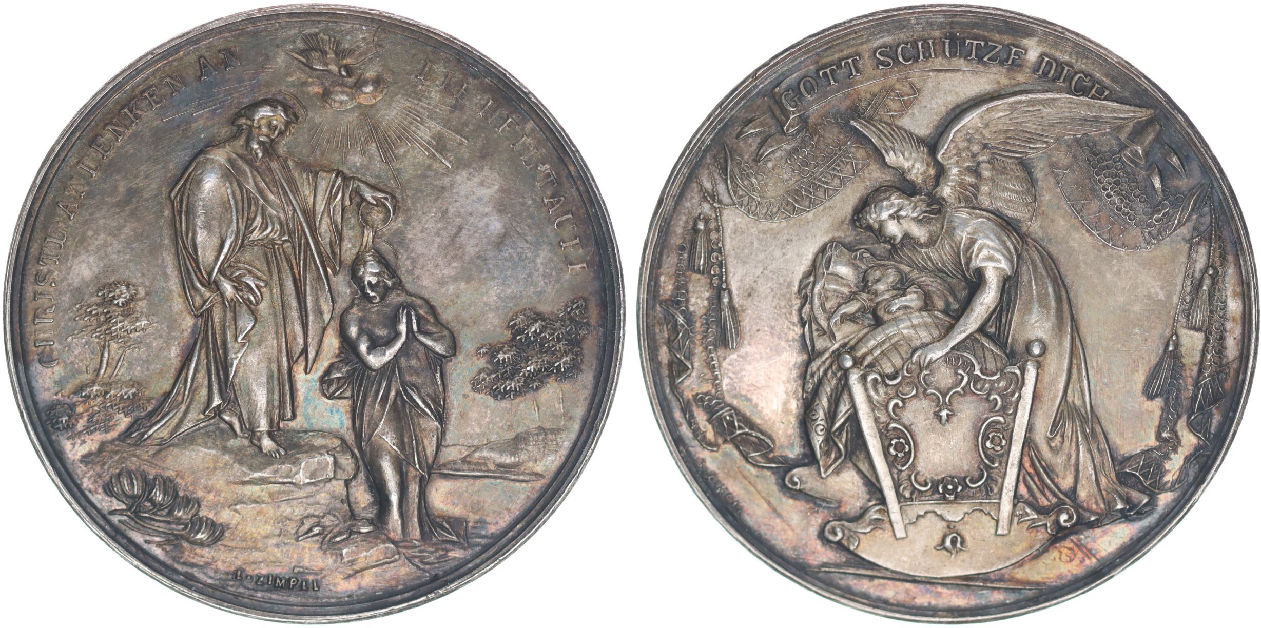 L.Zimpel - Sv.Jan křtí Krista, nad nimi Duch svatý v podobě holubice, krajina se stromy, písmo / anděl nad kolébkou opis, typ se záclonovými závěsy, b.l. (kolem r.1880) Sign., Ag 42 mm, 23,05 g, Gr.1423