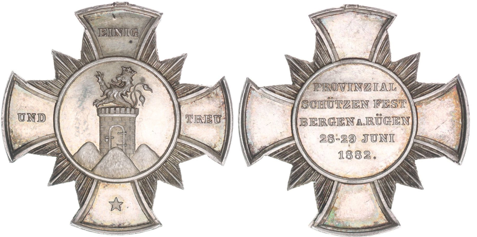 Německo - Rujana - Bergen na Rügenu - střelecký kříž k regionální střelecké slavnosti 28.-29.6.1882 Tlapatý kříž s paprsky, Ag 31x31 mm, 4,72 g_odstr.ouško