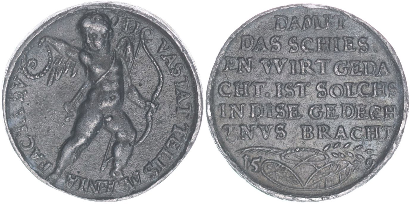 Německo - Nürnberg (Norimberk) - květinové střelby 1579 Stojící Cupido s lukem a věncem, opis / 6řádk.nápis, vročení Sign.V.Maler, Pb 23,5 mm, 5,53 g_R!