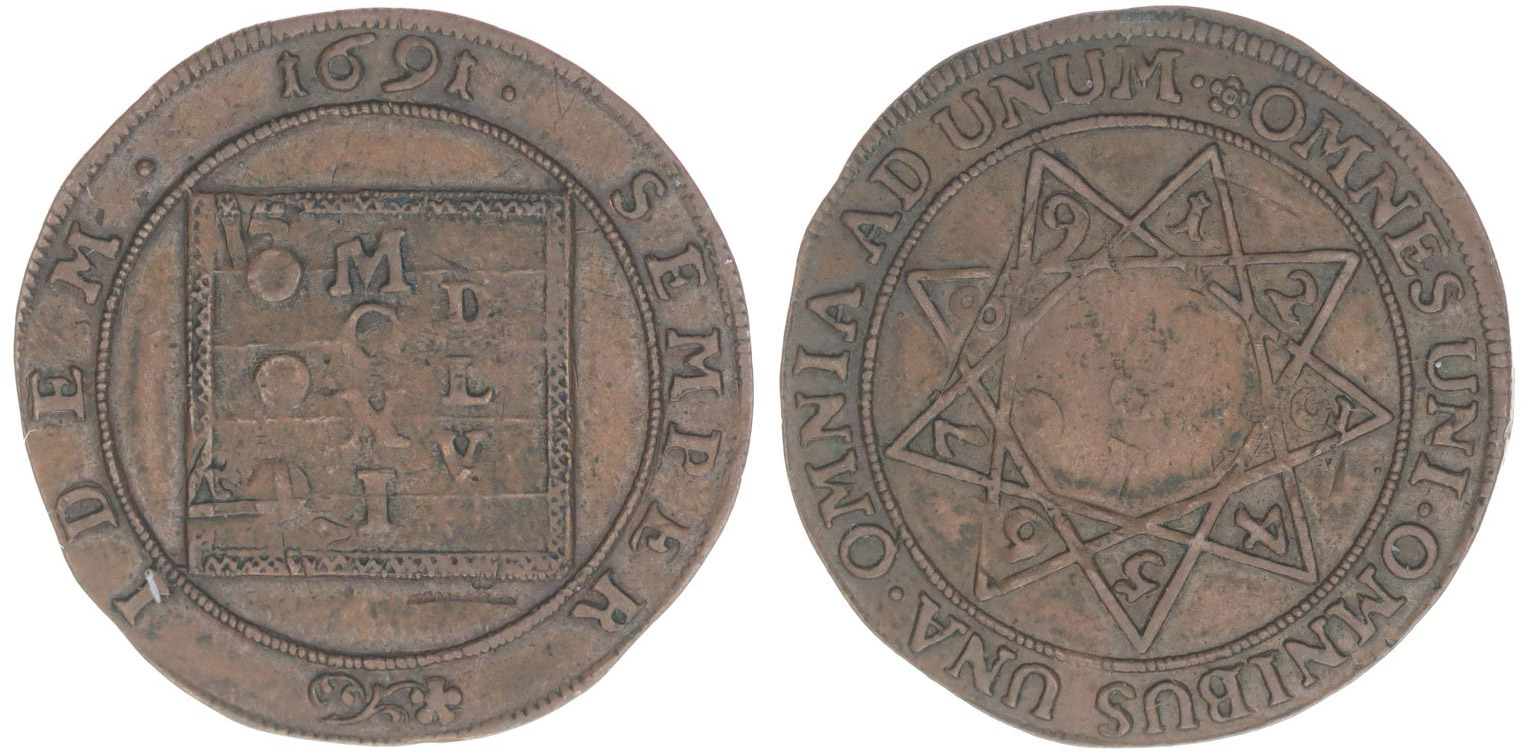 Početní fenik 1691, ve středu abakus s římskými číslicemi, latinský opis / 9cípá hvězda s číslicemi 1-9, uprostřed 0, latinský opis OMNES UNI OMNIBUS OMNIA OMNIA AD UNUM, Cu 25,5 mm Appel.4032, tab.8/15, ČNS Šumperk.82/747_dr.ned. RRR!