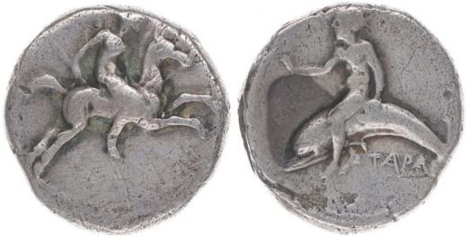 AR Didrachma, chlapec na koni zprava / sedící Taras na delfínu zleva, opis, SG.365