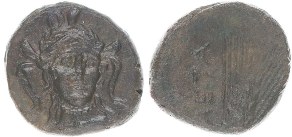 AE 15 mm, Hlava Atheny čelně / obilný klas, s nápisem META SG.417pod._R!