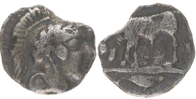 AR 1/6 Stateru, hlava Atény v korintské přilbě zprava / kráčející býk zleva, SG.438pod, 11 mm, 0,94 g_okr.ražbou R!
