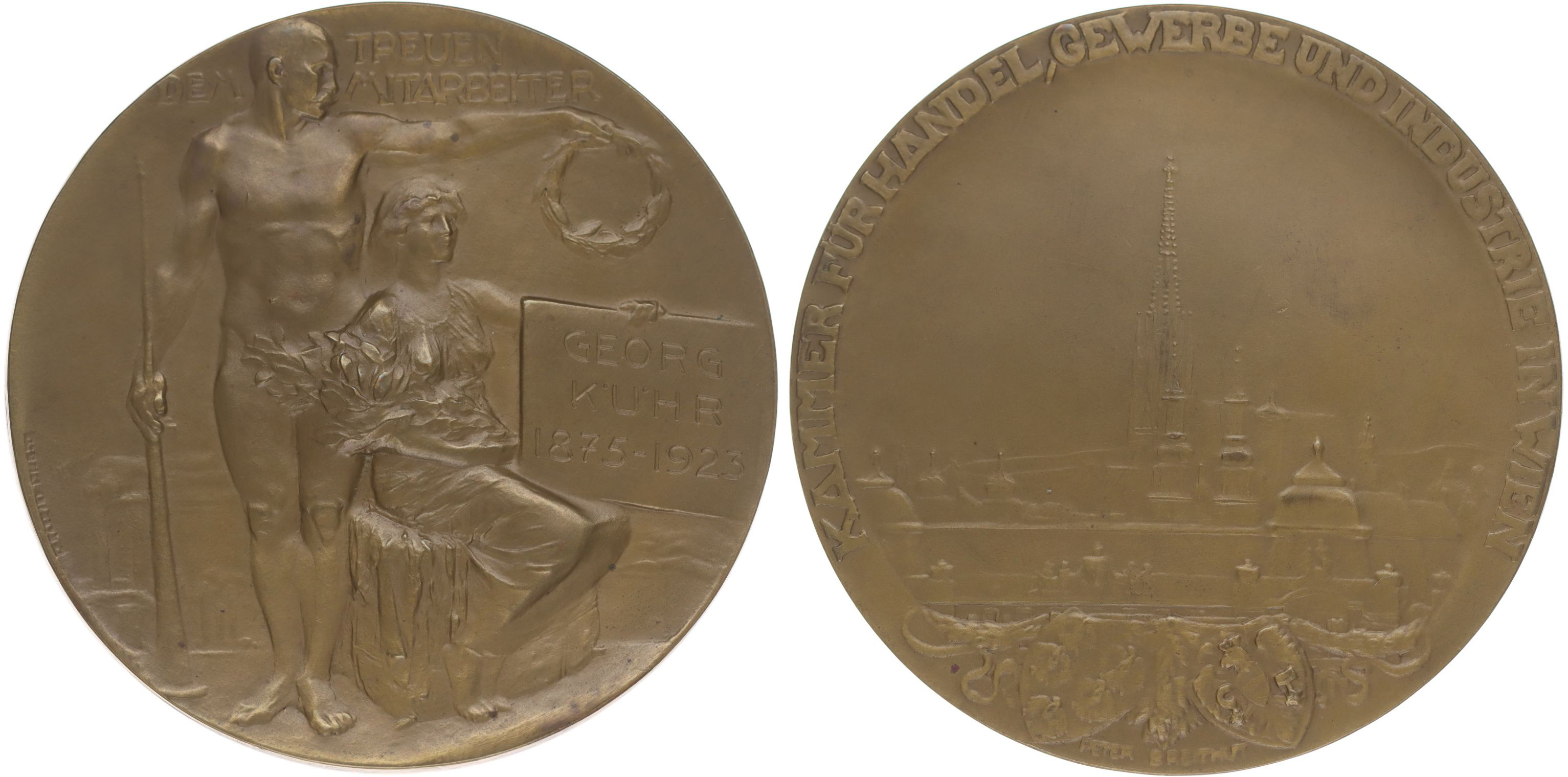 Georg Kühr (1875-1923) - obchodní, živnostenská a průmyslová komora ve Vídni, za věrnost, dvě stojcící alegorické postavy, opis / Chrám sv.Štěpána, opis, Sign., Bronz 65 mm