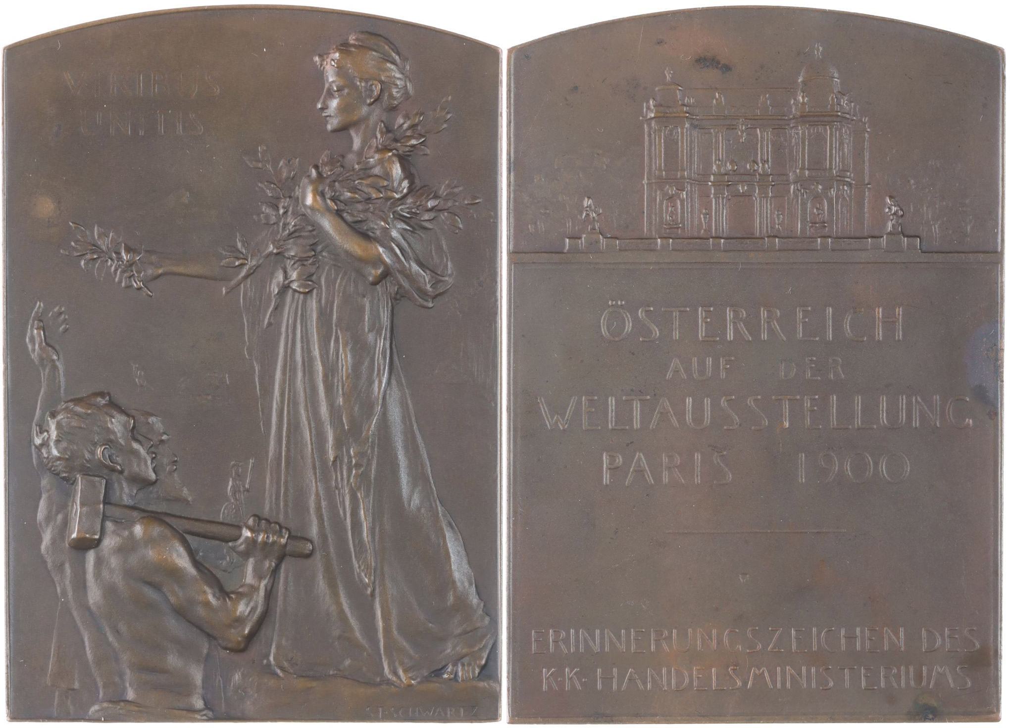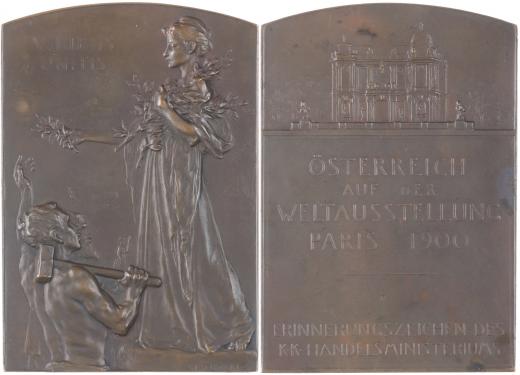 Rakousko na světové výstavě v Paříži v r.1900 Personifikace Austrie Viribus Unitis / 6řádk.nápis pod výstavním palácem, Sign., Bronz.plaketa 52x75 mm