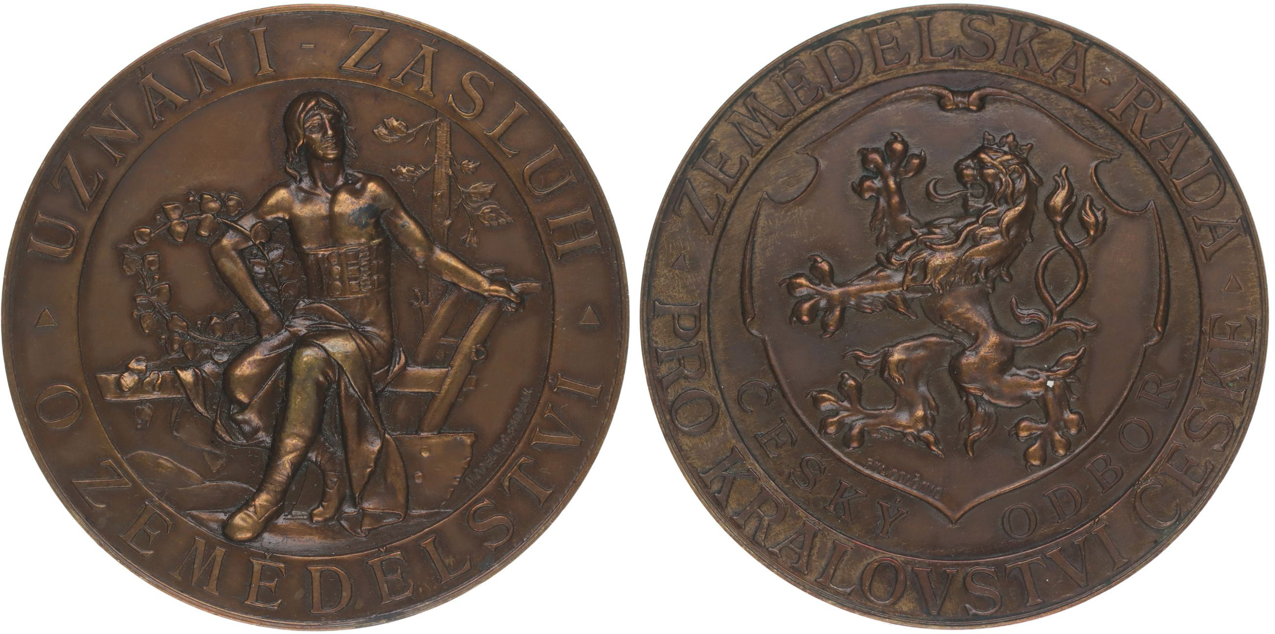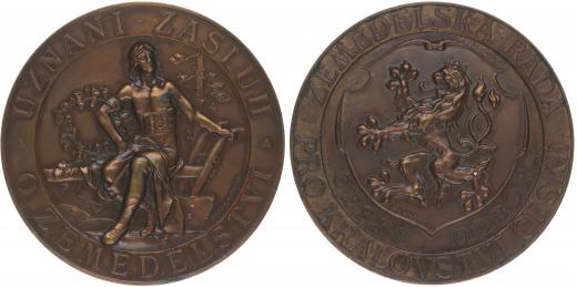 Zemědělská rada pro království České - Uznání zásluh#Br Přemysl Oráč sedící na pluhu, lípa, opis / český znak nápis a opis, Sign., Bronz 56 mm, 57, 47 g