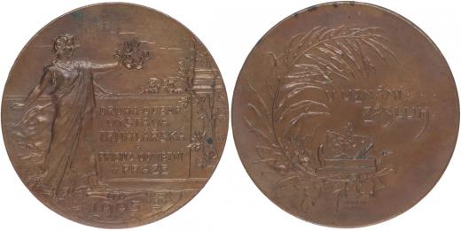 Praha - druhá odbor.výstava truhlářská a příbuz.odvětví 1905 Alegorická postava s věncem, 6řádk.nápis / V uznání zásluh ve věnci Sign., Bronz 47 mm