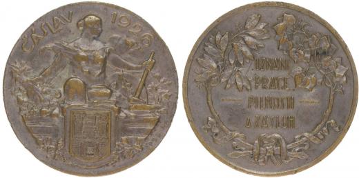 Podivín - uznání práce, pilnosti a zásluh 1926 Stojící ženská alegorická postava s atributy živností a zemědělství, znak města, opis / 4řádk.nápis v ozdobném věnci, Sign., Postř.bronz 42 mm_čet.dr.hry