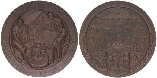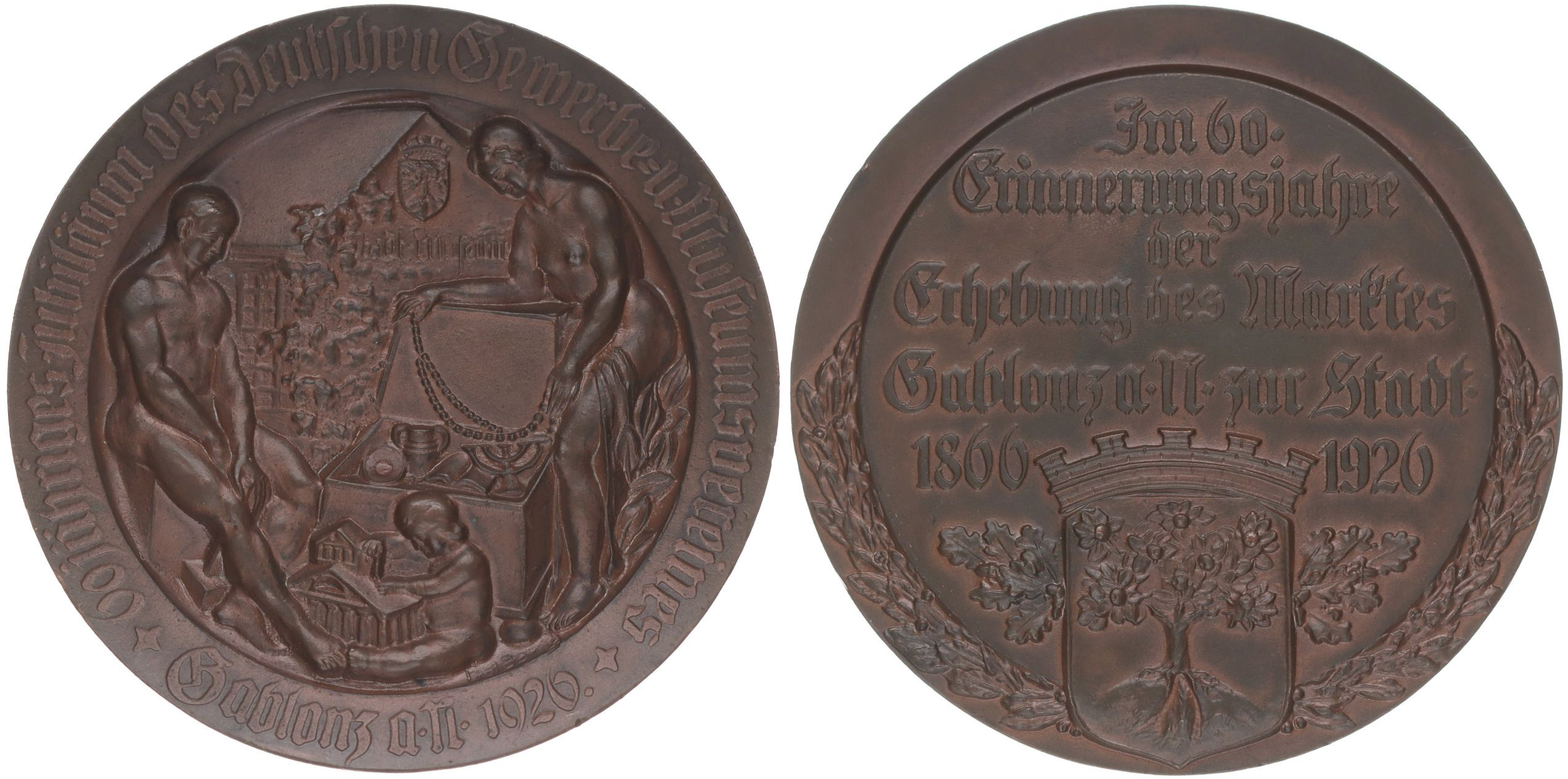 medaile k 60.výročí muzejního spolku 1866 - 1926 6řádk.nápis nad korunovaným znakem města / muž se ženou a dítětem s truhou před domem, Sign., Bronz 69 mm, 153 g