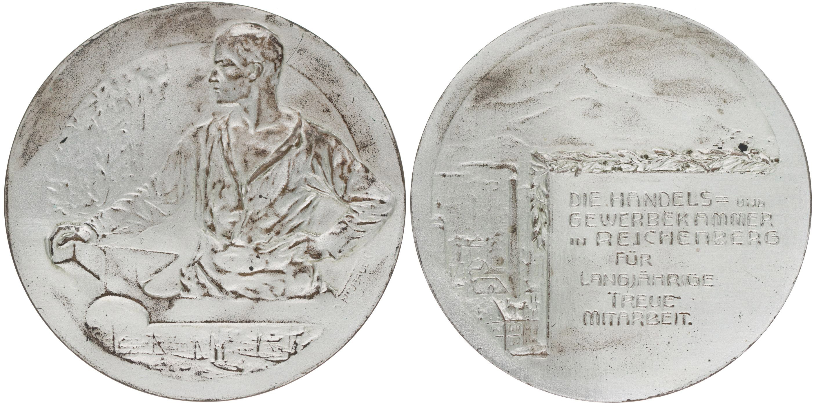 Neubauer - průmyslová a obchodní komora - za dlouholetou věrnou#Postř spolupráci b.l. Mužská postava s kovadlinou / pohled na Ještěd 7řádk.něm.nápis, Sign., Postř.bronz 60 mm, 76,65 g