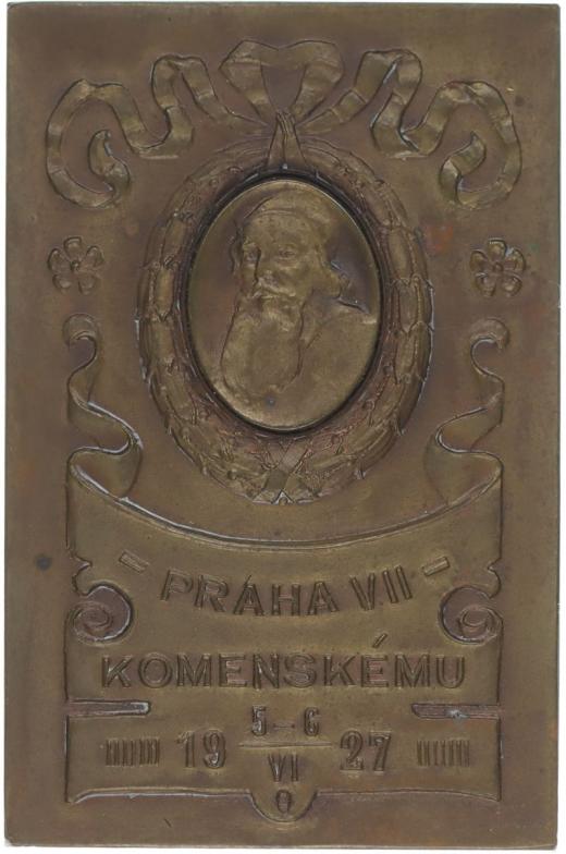 J.A.Komenský -Praha VII. Komenskému - 5.-6.VI.1927 J.A.Komenský v oválu pod ozdobnou stuhou, 4řádk.nápis Nesign., Bronz.plaketa 34x52 mm_jednostranná