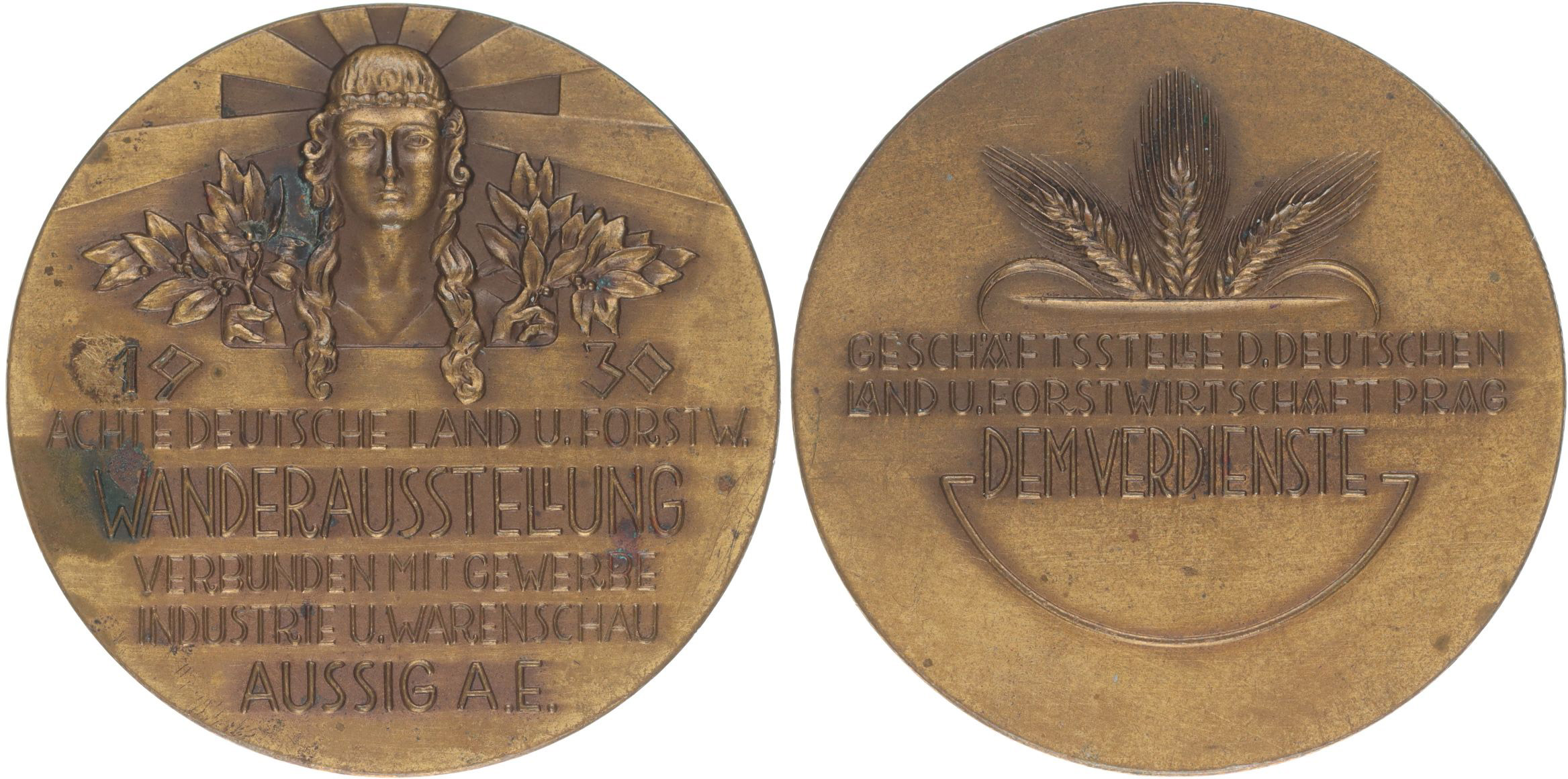 Nesign. - 8.německá zemědělsko-lesnická výstava - Za zásluhy, 1930 Alegorická hlava ženy, 5řádk.nápis / 3 snopy, pod nimi 3řádk.něm.nápis Bronz 50 mm, 48,02 g_n.škr.v av.