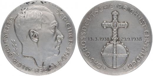 Hanisch - Medaile na obsazení Sudet, 29.9.1938#Ag Hlava A.Hitlera zprava, opis / říšské jablko, opis a nápis, nápis na hraně, Sign., Ag 835/1000, 36 mm, 21 g