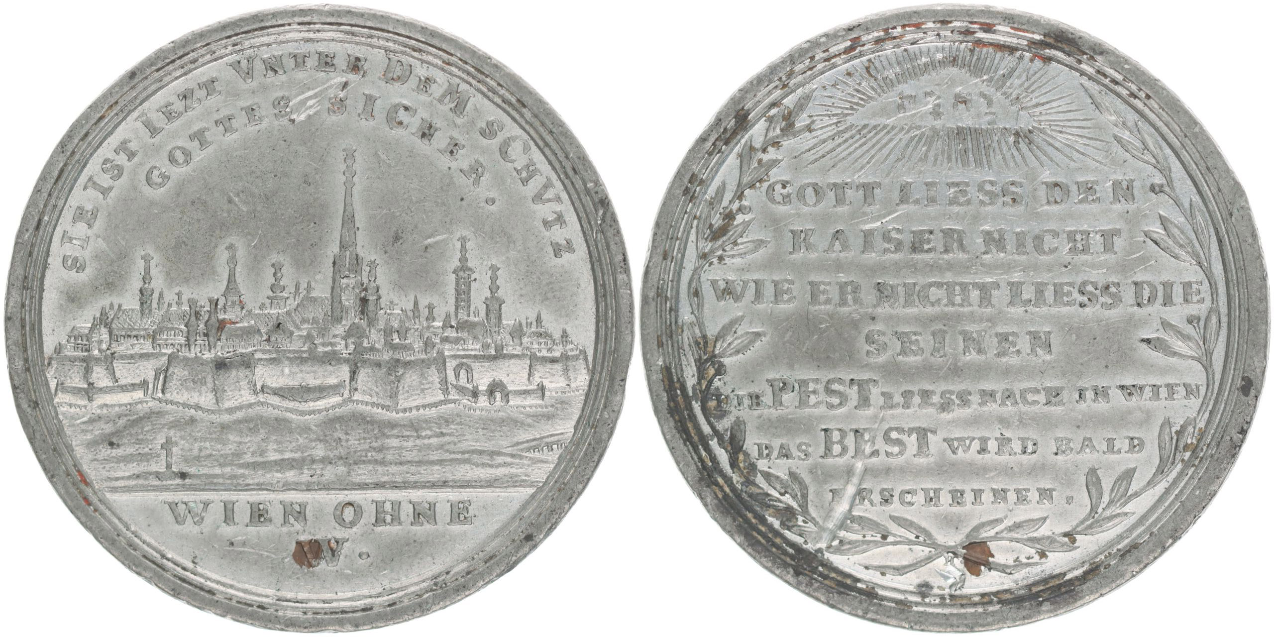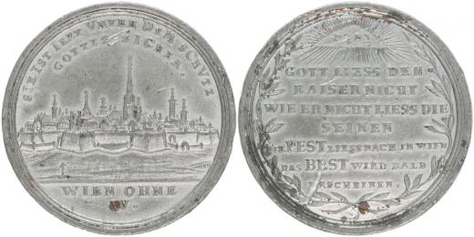 Vídeň - medaile na ukončení morové nákazy v r.1714 Pohled na město, 2řádk.nápúis v úseči, dvojitý opis / 7řádk.nápis ve věnci, Sign.H. (C.Hoffmann), Sn 44 mm, Mo.1436_R!
