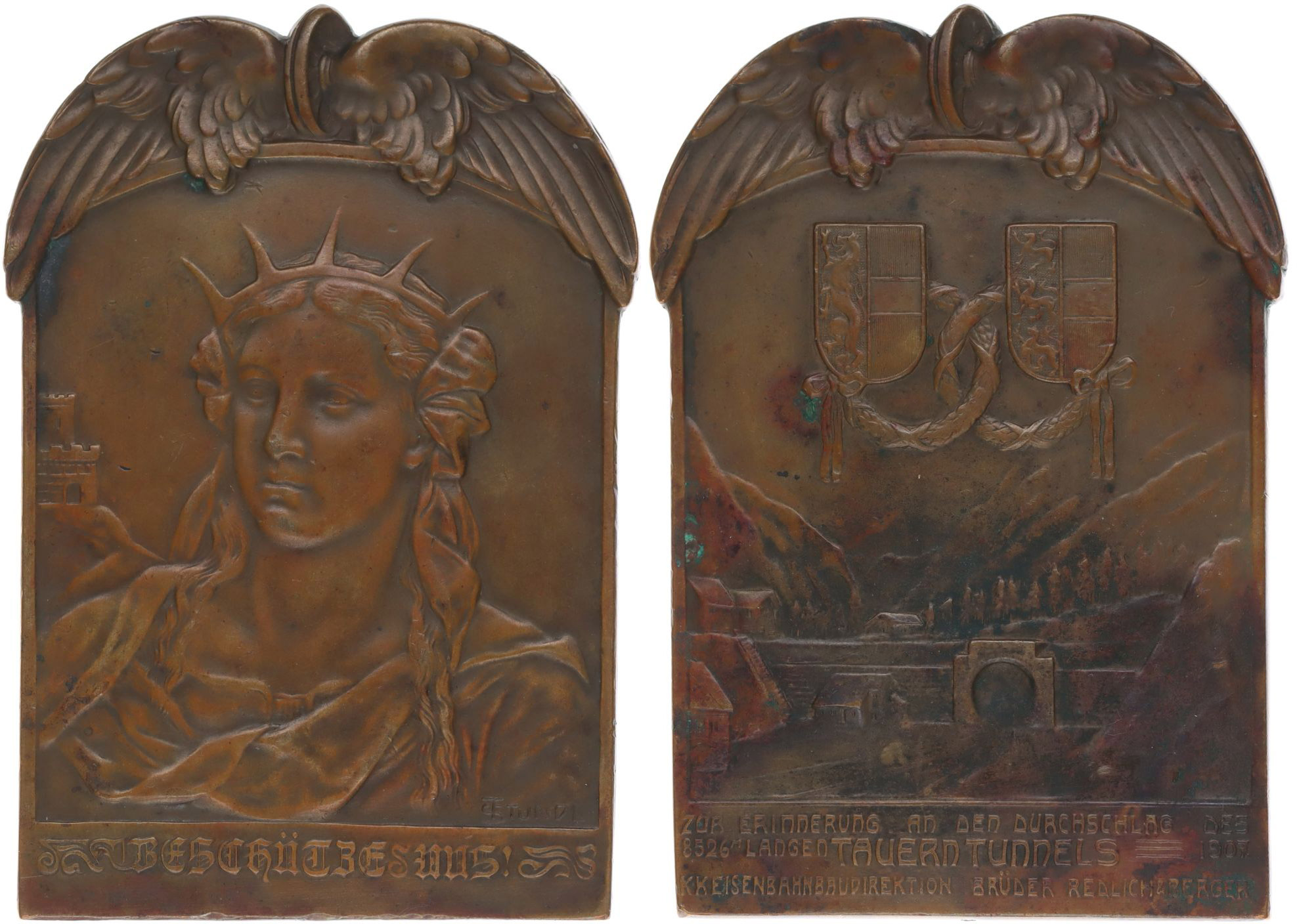 T.Stundl - otevření Tauernského tunelu, 1907 Ženské poprsí se trnovou korunou, nápis / portál tunelu v horské krajině, znaky, nápis, Sign., Bronz 53x78 mm