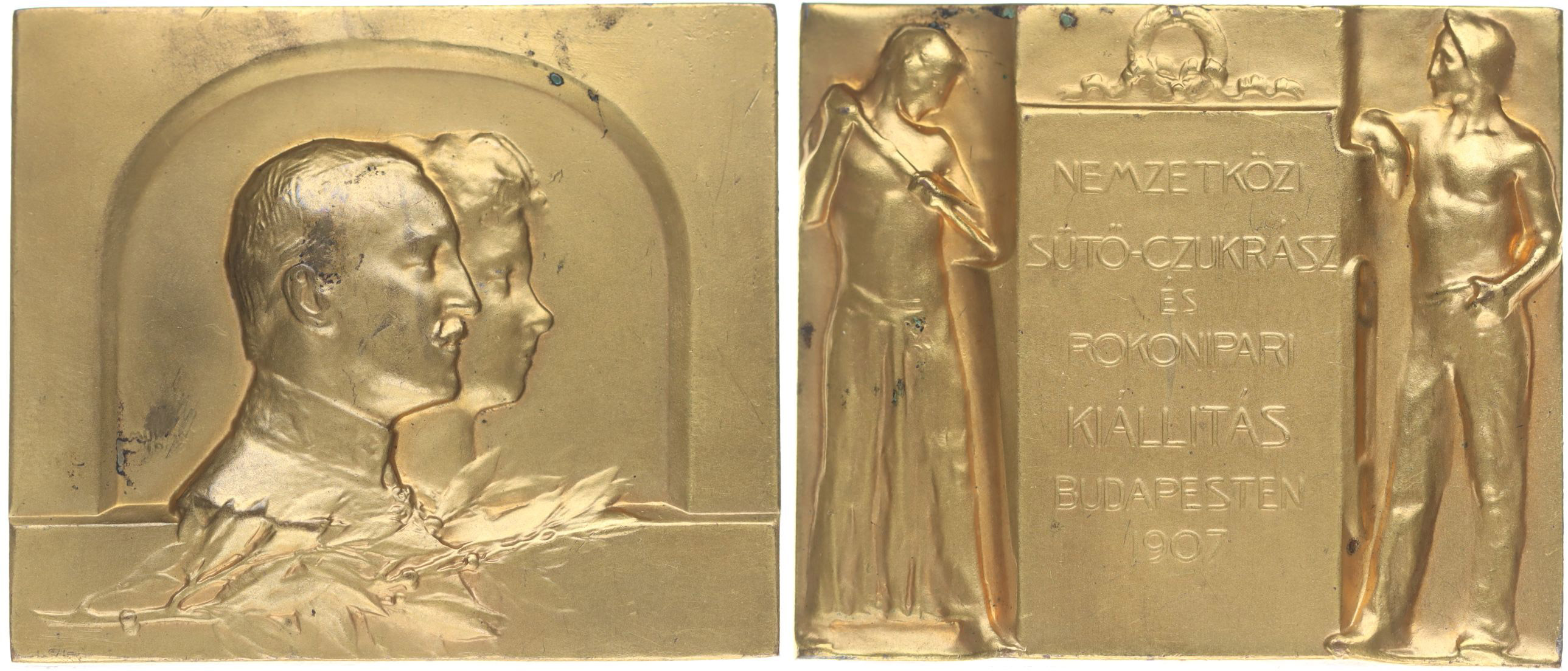 Nesign. - Budapešť mezinárodní výstava cukrářů a pekařů 1907 Dvojpoprsí arcivévody s manželkou zprava / 7řádk.nápis po stranách dvě stojící postavy, Pozlac.bronz.opaketa 46x55 mm