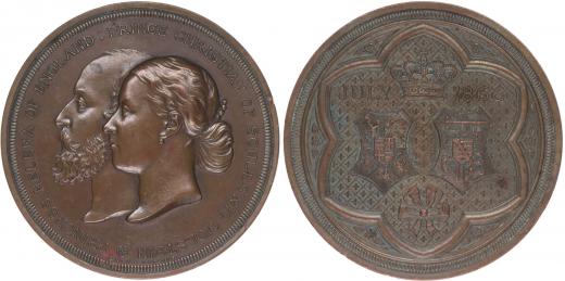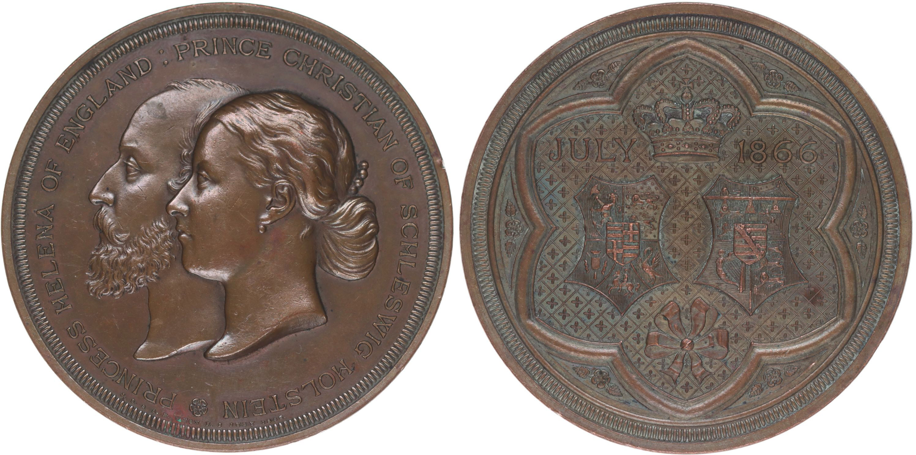 Princezna Helena (dcera král.Victorie) a princ Christian ze Schaumburg Holstein - svatební medaile Juli 1866, Dvojportrét zleva, opis / korunované dva erby v ozdobné kartuši, Sign.J.S.Wyon, Bronz 64 mm, 148 g
